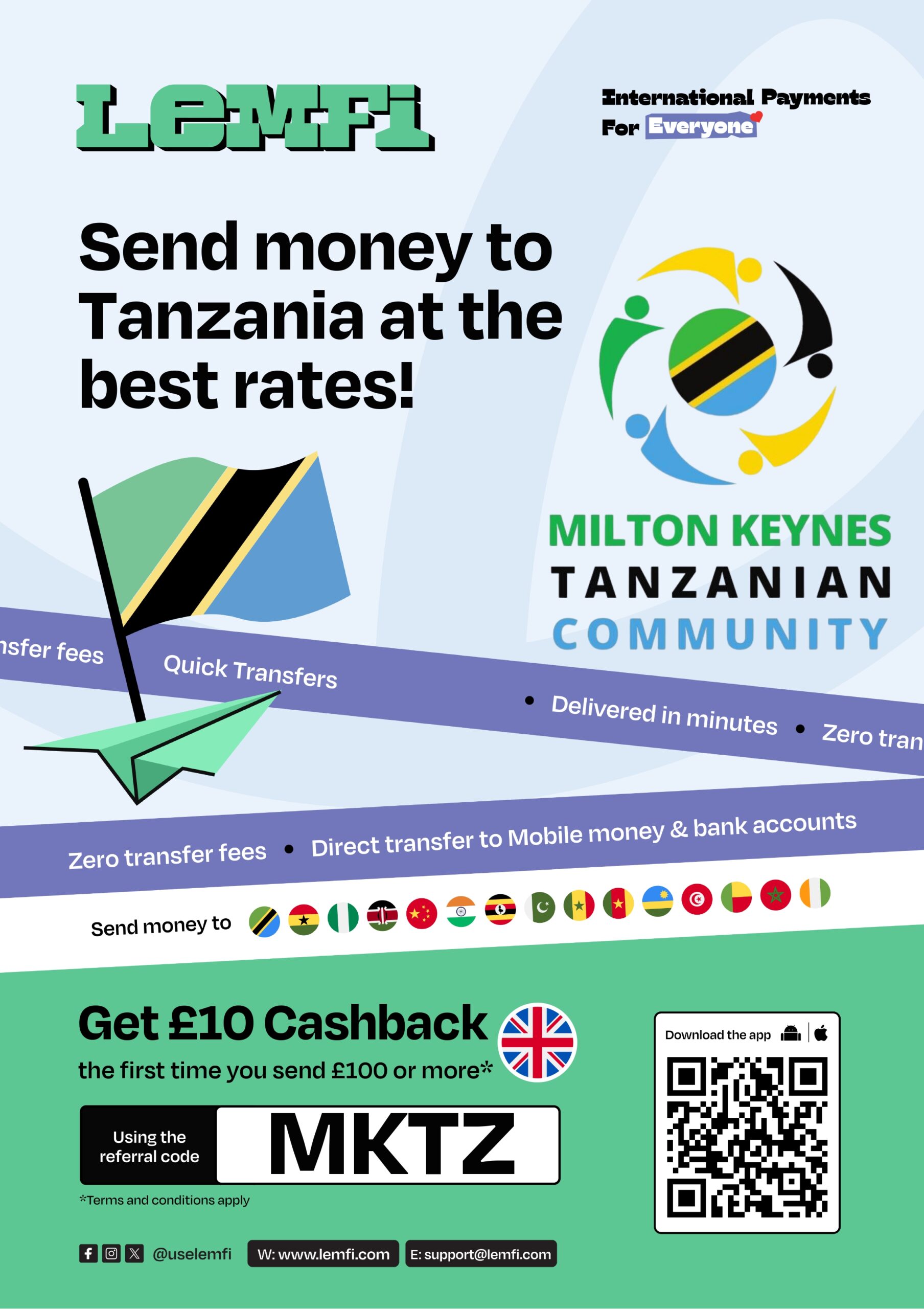 As a member of the Milton Keynes Tanzanian Community, you can get a £10 cashback bonus on your first transfer!